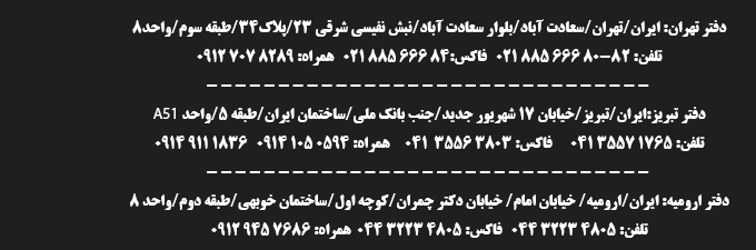 تلفن: 1765 557 0411 - فاکس : 3803 556 0411 – همراه: 0594 105 0914 - 1836 911 0914 آدرس : ایران \ تبریز \ خیابان 17شهریور جدید \ جنب بانک ملی \ ساختمان ایران \ طبقه 5 \ واحد A 51